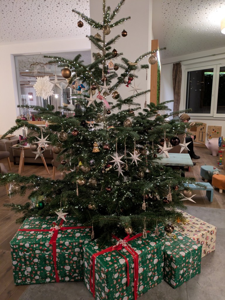 As the big day came closer, the hotel grew more and more Christmasy! On December 23rd, we were invited to pick out a Christmas tree on the hotel deck outside the dining rooms. There were a few fires in which we could roast marshmallows and small trees were displayed all around from which we could pick the perfect one for our room. (There was also glühwein available, but only for purchase which I thought to be a bit tacky to be honest.) A kind gentleman took a photo of our family picking out our tree who turned out to be Mr. Prommegger, the owner! My husband took the tree up to our room, and Kiddo and I snuggled up under the blanket on the outdoor sofa and enjoyed the views. Mr Prommegger chatted with us for awhile about the lack of kinderhotels in the US (he was surprised that I knew what they were), what it’s like living in the small village of Großarl, and Austrian Christmas traditions. We then headed upstairs, but not before we were given a box filled with baubles to decorate our tree. It was so much fun throwing on the tinsel, hanging up the ornaments, and getting into the Christmas spirit!