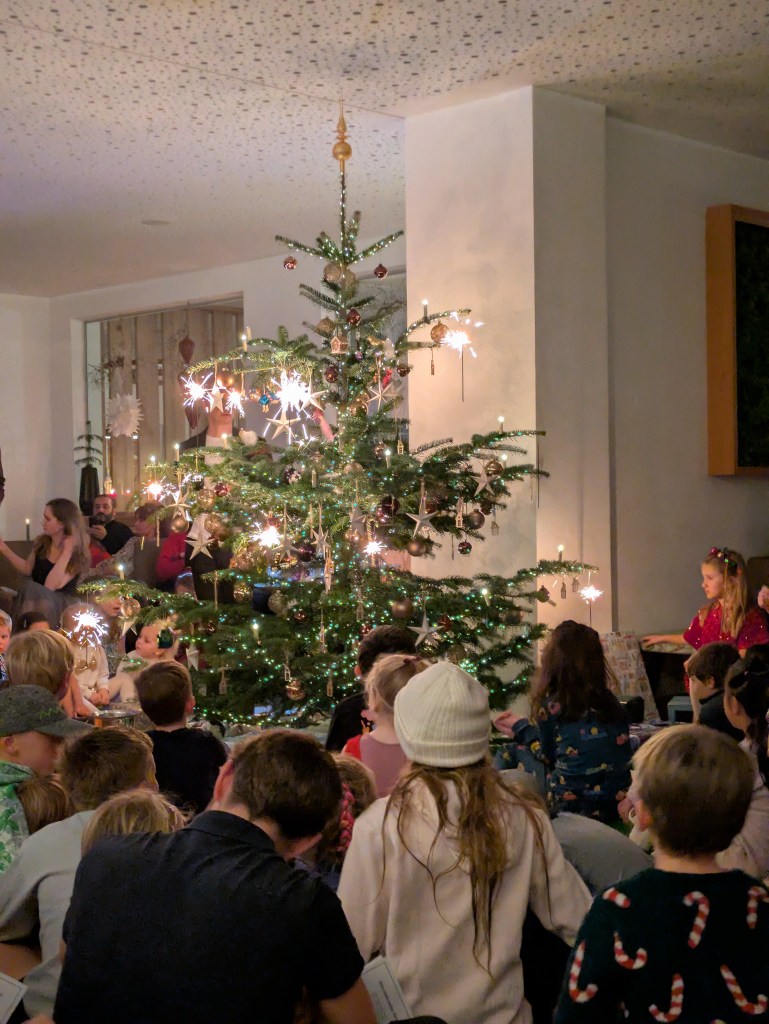 Next the Christkind (the child-like angel that flies around delivering presents) gave presents to the children. In other words, parents were supposed to bring a present for their child to reception who would wrap it and place it under the tree to be given out to the children, called by room number and name. (We had not anticipated this and with very little room in our suitcases, we had only packed two books for Christmas Day so that felt a bit awkward. I also noticed some kids receiving more elaborate gifts and it made me wonder if there was a better, more equitable way to do this.)